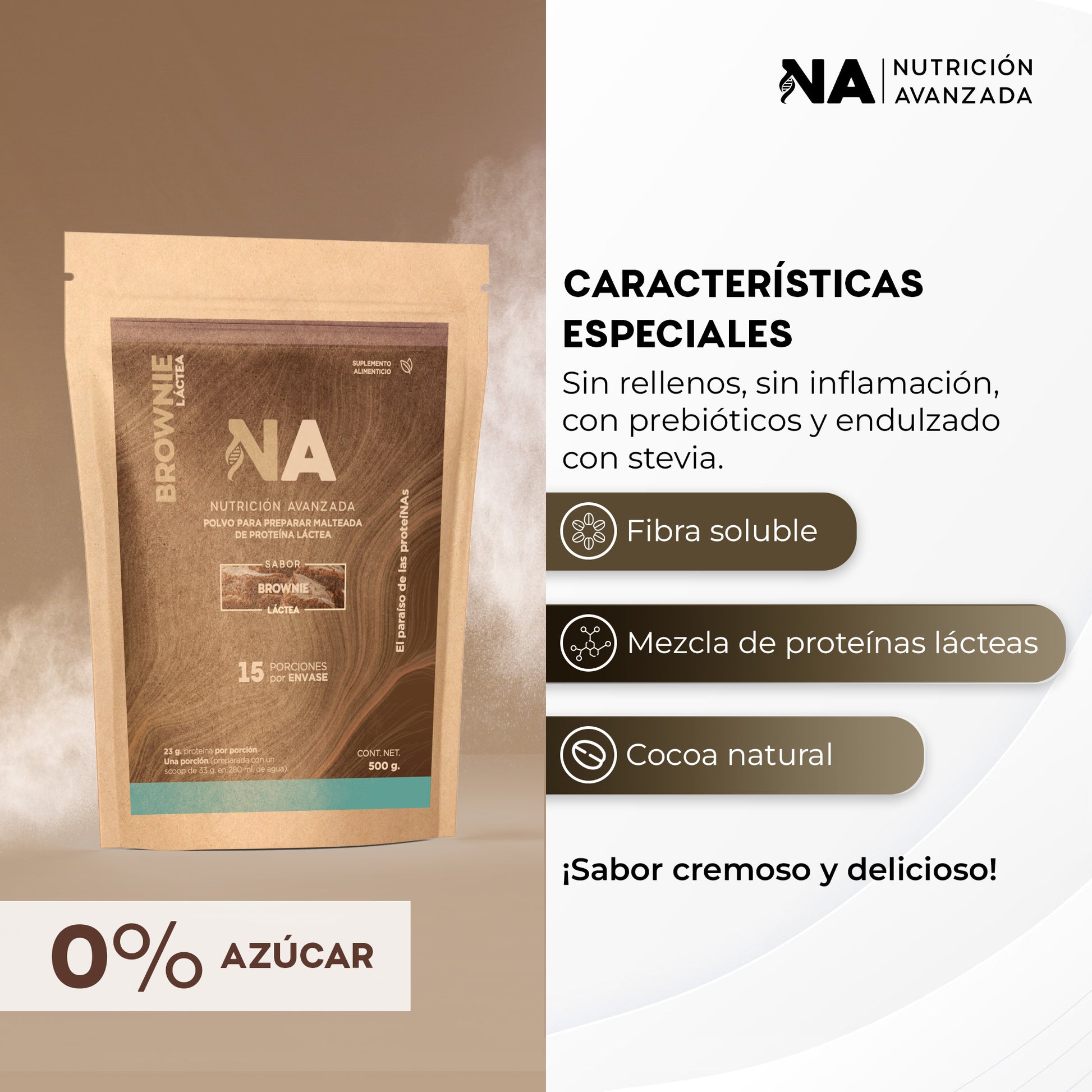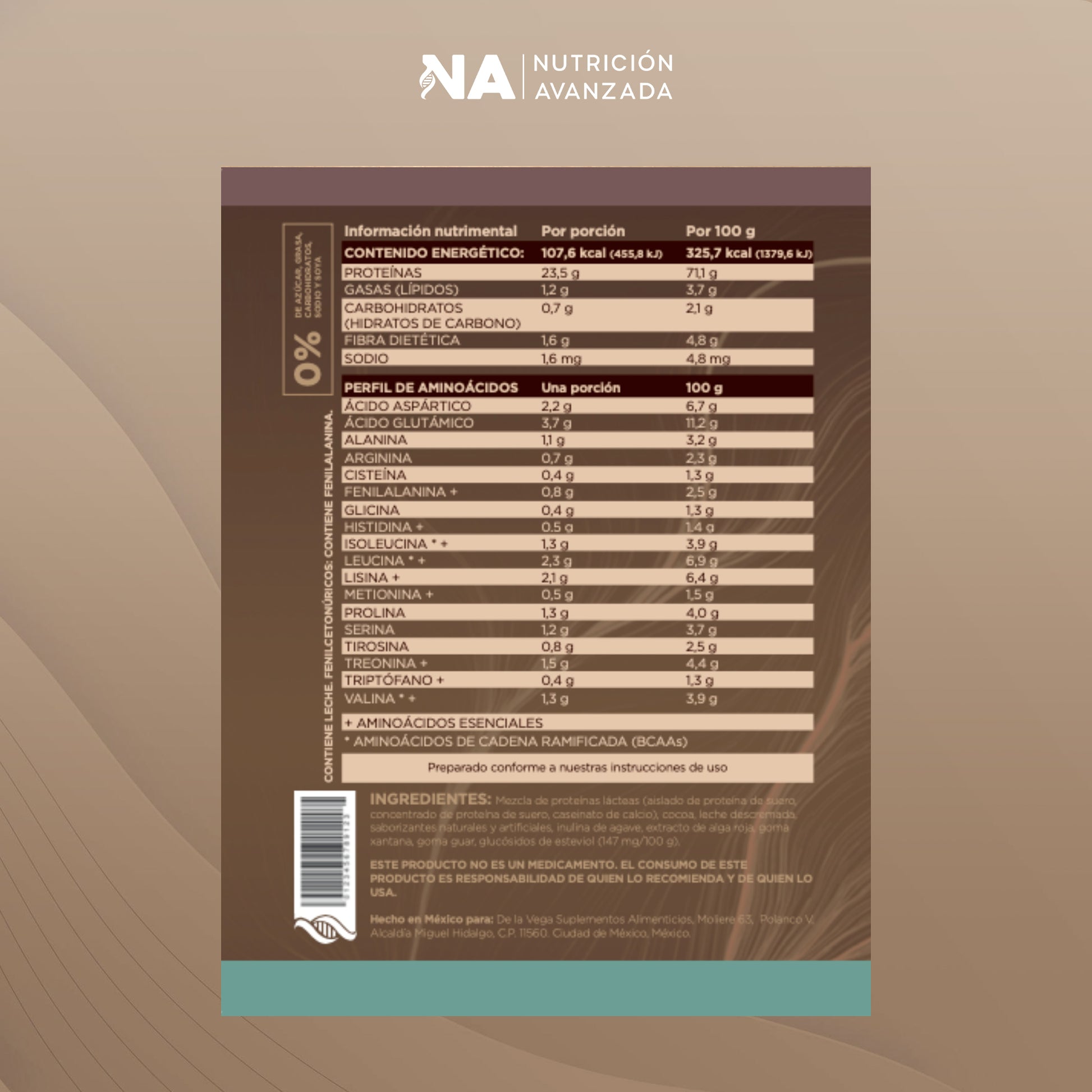Ingredientes: mezcla de proteínas lácteas (aislado de proteína de suero, concentrado de proteína de suero, caseinato de calcio), cocoa, leche descremada, saborizantes naturales y artificiales, inulina de agave, extracto de alga roja, goma xantana, goma guar, glucósidos de esteviol